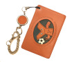 サッカーモチーフの本革製パスケースです。アルファベットがサッカーボールを蹴っているユニークなデザインです